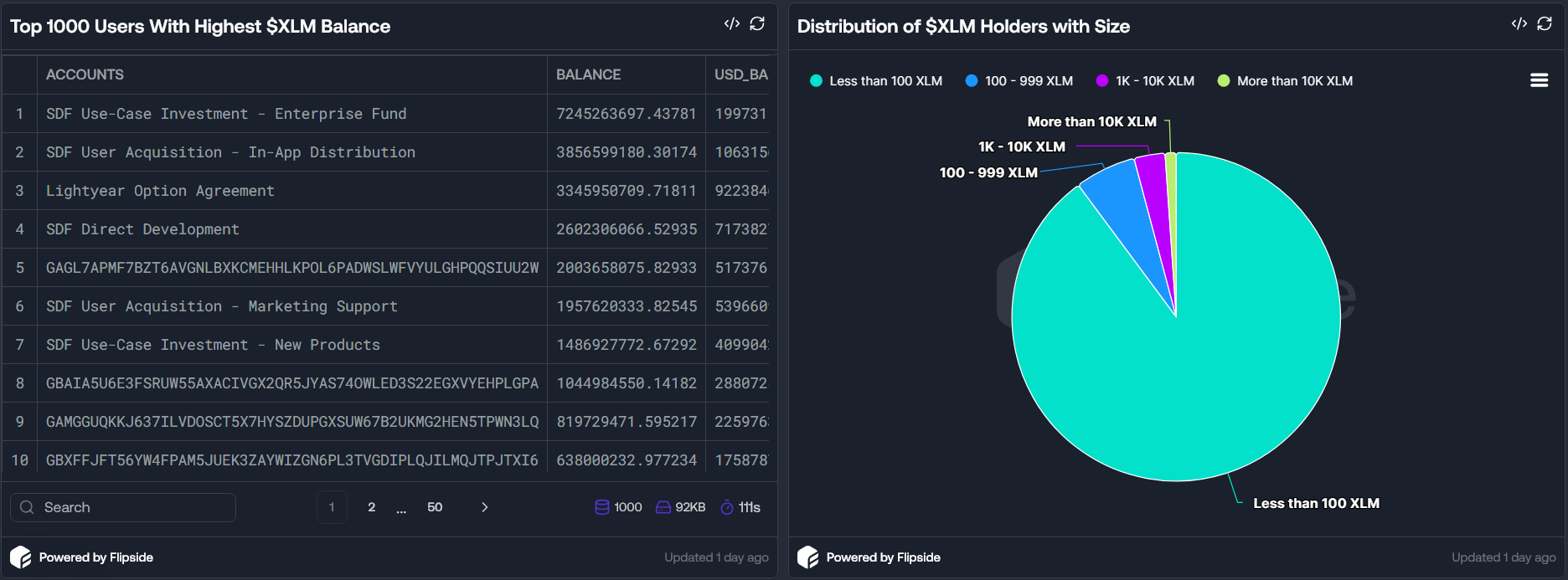 Stellar туралы негізгі алаңдаушылықтардың бірі – XLM ұсынысының шоғырлануы. Flipside Crypto мәліметтері бойынша, ең ірі 10 XLM әмияны шамамен 25 млрд XLM ұстайды. Жалпы айналымдағы ұсыныс 30,9 млрд XLM құрайды, яғни ұсыныстың шамамен 80%-ы шағын топқа тиесілі.