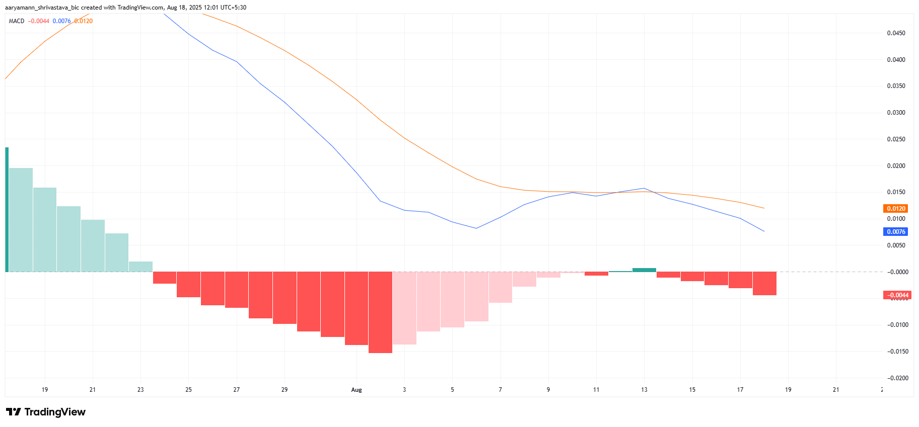 Сонымен қатар, гистограммада қызыл жолақтардың көбеюі аю импульсін одан әрі растайды. Бұл сигналдар сатылым белсенділігінің артып келе жатқанын көрсетіп, альткоинді қысқа мерзімде төмендетуі мүмкін.