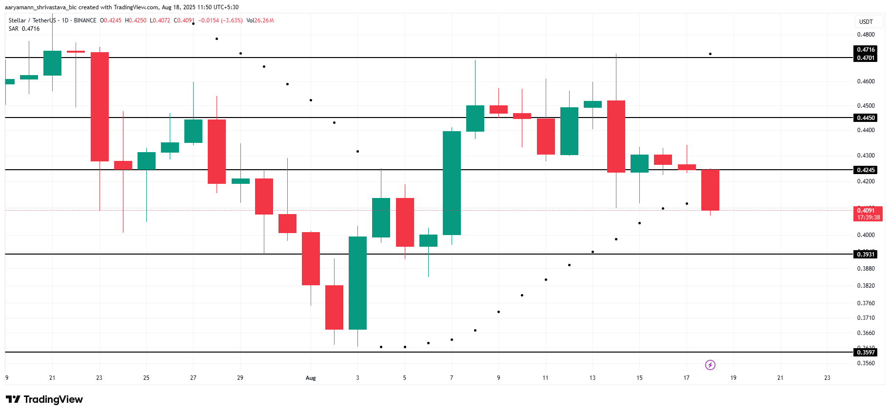 Жазу кезінде Stellar 0,409 долларға саудаланып, төмендеу қаупіне тап болып отыр. Техникалық факторлар 0,393 доллар қолдау деңгейіне қарай ықтимал төмендеуді көрсетеді, бұл аюлық бақылаудың алдағы сессияларда күшейе беретінін анықтауы мүмкін.